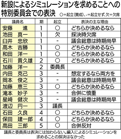 これに対し複数の議員が「新設、編入の一方ではなく両方を想定するべき」と指摘すると、事務局幹部は「どちらかを選ぶのではなく、これでどうか、と示す。反対なら対案を示してもらう」と述べた。これに対して「市民の感覚に立つべき」と苦言を呈する議員もいた。新設と編入のどちらを提案するかは24日の会議まで明らかにしない方針。