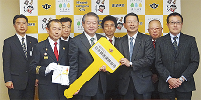 今年度は南足柄市を含む17都県8市5町4村に寄贈した。市に贈られた車両は1台約517万円の軽消防自動車。四輪駆動で最高レベルの放水量をもつ小型ポンプを後部に積載している。