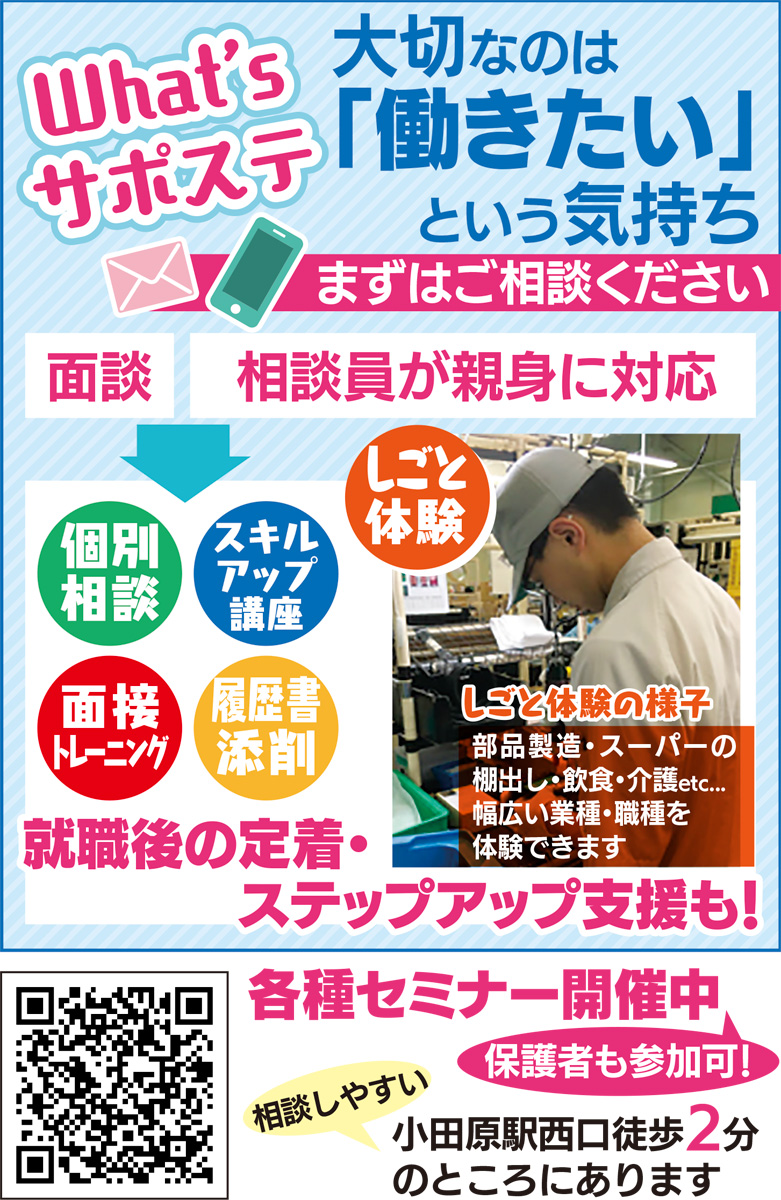 「働きたい、でもどうすれば…」。未経験者やブランクがある等就職への不安や悩みを抱える若者を支援している『サポステ』。15歳〜39歳で働く意欲・関心のある人を対象にした職業的自立サポートの総合窓口で、県西では開所以来6百人以上が新たな道をきりひらいた厚労省認定事業だ。