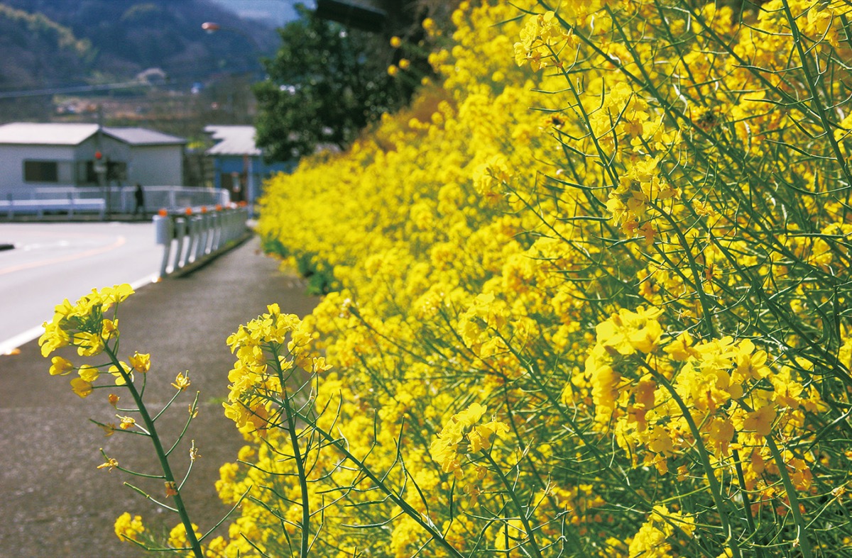 山北町岸の南原古墳群周辺の斜面で今年も群生した菜の花が春風に黄色い花を揺らしている=写真、3月4日撮影=。