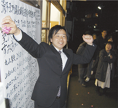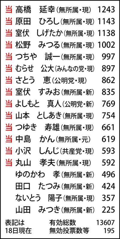 最年少の室伏氏は選挙期間中ほぼ毎日駅改札に立って通勤客などに挨拶。駅伝さながらに走った距離は50キロを超えるなど、若さを際立たせた。「辻立ちで有権者の声が聞き取れた。走ることで町づくりの課題も目の当たりにした。母校・湯中移転については訴えてきた通り、子育て世代の声を伝えたい」とコメント。同じく新人の善本氏は、長谷川俊子氏(公明党)の後継。「町を元気にして欲しい、安心して老後を迎えたいという声を聞いた。新しい風を吹き込んで、停滞しているものを活性化させる」と意気込みを語った。