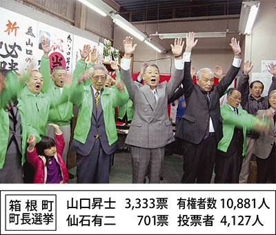 箱根町長選挙が28日に行われ、山口昇士氏(68・現職)が4選を果たした。4年前の町長選と同様、山口氏と仙石有二氏という顔触れで雨だったこともあり、投票率は37・93%にとどまり過去最低を更新した。