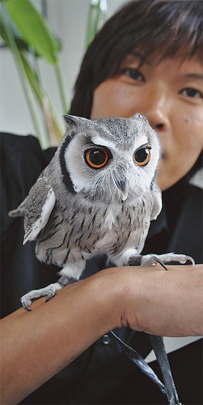 静かに真鶴の絶景を眺める横顔が何ともクール。ガラス玉のような瞳に魅了された人々が、今日も彼(彼女?)に会いに来る。名前は「ふぅちゃん」。真鶴のレストラン「海辺の途中」で暮らしている。鳥好きの店主が1年前に購入したフクロウで性別は不明。いつの間にか店の看板娘(息子)になり、昨年末の旅番組出演を機に、ファンの数を増やしたとか。正式な名前はアフリカオオコノハズクで、ササミなどの肉が好物。自分よりも弱そうな者に対しては体を膨らませて威嚇し、強そうな相手を見ると木の枝のように細く縮む。店長の入江真太郎さん曰く「世渡り上手なんです」。