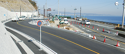 このため県は7年ほど前から改良工事を始め、国道から”抜け道”に入れないようにし、国道から根府川駅方面に右折しやすく、また根府川駅側から国道に出やすく整備した。