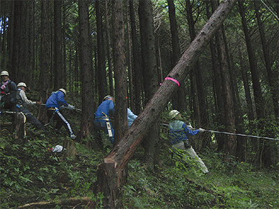 湯河原町鍛冶屋の町有林が17日、「湯河原万葉の森づくり体験活動」で賑わった。町民有志のほか、社会貢献活動の一環として(株)日本触媒の職員や家族など90人ほどが集まり、下草刈りやヒノキの間伐に汗を流した。この活動は同社や町、国土緑化機構、かながわトラストみどり財団が2年ほど前に結んだ協定によるもので、今年で2回目。昨年は苗木を植えていた。