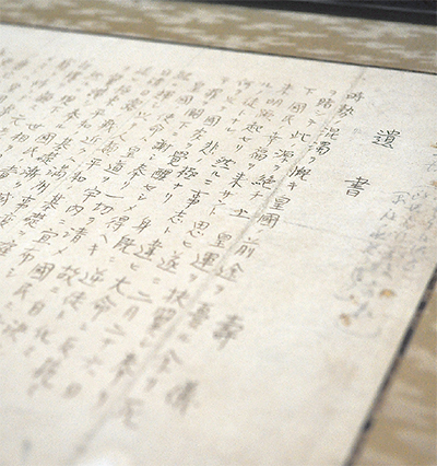 遺書は事件から8日後、大尉が果物ナイフで自殺する直前に書いたもので、同志、陸軍大臣宛を含めた計3通が額装になっている。落ち着いた筆跡で「国民ハ太平ニ慣レテ社稷ヲ顧ス」「元老重臣財閥官僚軍閥ハ天寵ヲ恃ンテ専ラ私曲ヲ営ム」など国の前途を憂い、決起に至った気持ちを綴っているほか、結果的に「逆徒」とされた事について「悲ノ極ナリ」とも述懐。獄中の部下7名について「小官ノ命ニ服従セシノミニテ何等罪ナキ者ナリ」と慮り、「外敵」に備えるため早急な軍備の充実や空軍の独立なども提唱している。