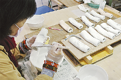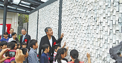 湯河原駅前広場の東側で今月3日、地元小中学生の陶板レリーフが披露された。町村合併60周年記念事業の一環で、子どもたちの成長を願い「竹」がモチーフになっている。1枚の粘土板を筒状にし、小中学生約1500人が拳を押し付けて形作った。観光会館近くのクレアーレ熱海ゆがわら工房が釉薬塗りや焼成を担当。節々の中に、東京五輪スタジアムや駅前広場の設計を手掛けた建築家・隈研吾氏の作品も加わった。小学生の頃、親のゴルフに同伴してよく湯河原に来たという隈氏。つややかな竹林を前に「ヒューマンな感じ。この町のイメージにぴったり」と目を細めていた。