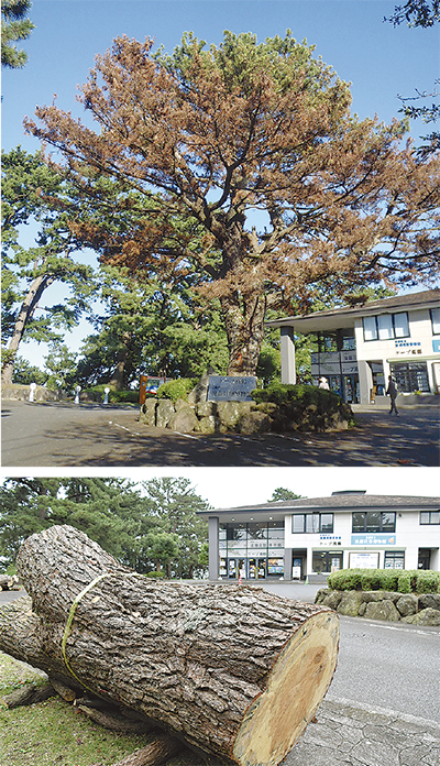 ケープ真鶴前の松の大木が8月から急速に枯れ始め、松くい虫の被害拡大防止のため、先月下旬に伐採された。高さは10mほど、太さは約1mあり、ケープ真鶴前はぽっかりと空が広がった。お林には2千本を超えるクロマツがあるとも言われ、現地を調査した専門家も「国内でもきわめて貴重」と評価している。若い松が育つエリアもあるとされるが、町では毎年数百の薬剤を注入。それで毎年40〜60本ほどが松くい虫や寿命が原因で枯死し、伐採を余儀なくされている。