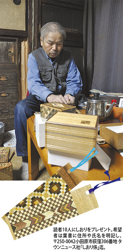 1年前、作業中に握っていたノミを落とし、脳梗塞が判明。数カ月リハビリを重ねた結果、ようやく握れるようにはなった。それでも肩から指先まで痺れ、材料を押さえられなくなった。「仕事できないのは悔しいね。『生涯現役』が口癖だったのに、ただ飯食らってテレビ観てるんだよ」と天井をあおぐ。外出先で自分ではない誰かが作った秘密箱を手に取ると、カタカタ音をたてる事がある。「隙間なく美しく仕上げないといけないのに、カンナも使えない職人がいる」――本物について一通り語り終えると「これあげる」と、おもむろに1枚の栞(しおり)を取り出した。寄木を削った「ズク」にリボンを通し、ゆっくりと細いビニール袋に納める日課は、手の訓練の一環。「箱を作りたいよ」。生涯現役とは言わずとも生涯職人であり続ける。まだ終わるわけにはいかない。