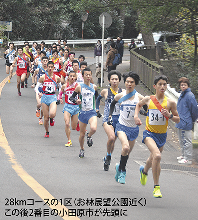 第60回を迎えた真鶴半島駅伝競走大会が8日朝に開催され、お林展望公園前をスタート地点に社会人や中高生ら男女85チームが襷をつないだ。1市3町・一般実業団・高校男子(6区・28・6km)の各部門の中では小田原市チームが1時間29分58秒の今大会最速を記録。最終区の走者・樽木将吾さんが片腕を振り上げてゴールを切った。1区を2位でつないだ同チームの権守竜也さんは「真鶴はアップダウンが多く、魚座近くの直線は海風もきつかった」と振り返った。地元真鶴町チームは1時間54分46秒だった。女子・中学生(6区・18km)各部門の中では鶴嶺高校の1時間7分9秒が最速だった。