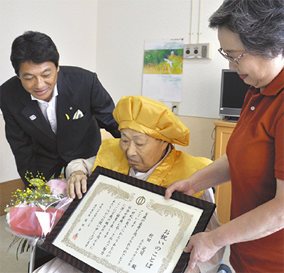 湯河原中央温泉病院に入院する村田定司さんが、6月2日に100歳の誕生日を迎え、5日に冨田幸宏町長から「約1世紀にわたる社会や家庭への努力」を称える「お祝いのことば」を手渡された。村田さんが生まれた大正6年(1917年)は、ちょうど第一次世界大戦の頃。青年時代にはパプアニューギニアのラバウルに出征し、戦後になり湯河原で旅館の仕事に携わった。妻マサさん(故人)は駄菓子店を経営し、冨田町長が少年時代によく通っていたという。村田さんは食べることが好きで、上下に歯が残っており、肉もしっかり噛んで食べているという。