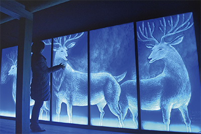 梅の宴で賑わう幕山・湯河原梅林の管理棟に月夜に照らされたシカたちが幻想的に浮かび上がった。地元の美術作家・ゆるかわふうさん(37)の作品「白鹿図」で、断熱材を電動研磨機などで削り、微妙に厚さを変えることで濃淡を出す「フォーム・ドローイング」で描いた。来場者からは「幻想的」「今夜はいい夢みられそう」の声が相次いだ。
