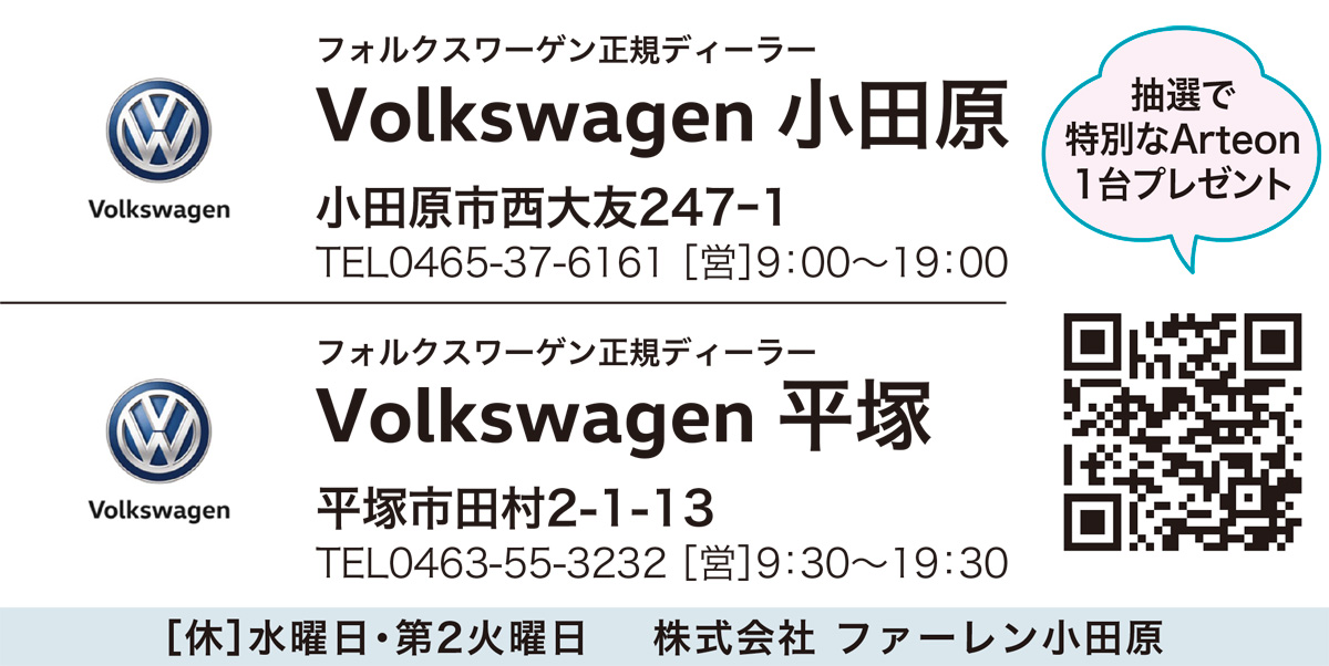 さらに、VW小田原/平塚では新元号「令和」を記念して、大幅値引きを実施中。ゴルフシリーズ全車種に加え、ティグアン、アルテオンも用品10万円分がプレゼントに。詳しくはショールームへ。