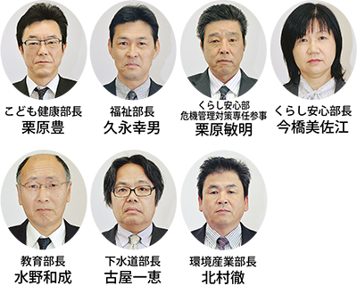 【部長級】▽政策部長(くらし安心部長)谷屋彰▽政策部専任参事(兼)政策部文書法制課長(兼)選挙管理委員会事務局専任参事(兼)選挙管理委員会事務局長(企画総務部専任参事(兼)企画総務部文書法制課長(兼)選挙管理委員会事務局専任参事(兼)選挙管理委員会事務局長)山口俊次▽市長室長(こども健康部長)八木優一▽財務部長(環境産業部長)高橋昌和▽くらし安心部長(市長室参事(兼)市長室人事課長)今橋美佐江▽くらし安心部専任参事(くらし安心部参事(兼)くらし安心部くらし安全課長)栗原敏明▽福祉部長(福祉部福祉事務所参事(兼)福祉部福祉事務所障害福祉課長)久永幸男▽こども健康部長(こども健康部参事(兼)こども健康部こども育成課長)栗原豊▽環境産業部長(環境産業部参事(兼)環境産業部観光課長(兼)環境産業部商工課長)北村徹▽下水道部長(下水道部参事(兼)下水道部下水道河川整備課長)古屋一恵▽教育部長(企画総務部参事(兼)企画総務部行政経営課長)水野和成▽消防長(くらし安心部専任参事)小松昭一