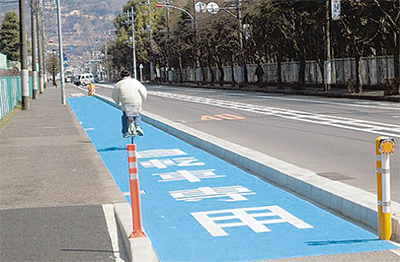 今回整備されたのは、バス停「日立南」から「日立東門」付近の日立側区間118m。自転車が安全に通行できるように、車道と同通行帯の間に縁石、ポールなどを敷設した。違法駐車等防止重点区域に指定されている同通行帯への自動車等の違法駐車を防ぐ狙いもある。
