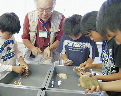 スクールミュージアムとは、博物館、学校、地域が連携して行う出張展示のこと。同校では展示に合わせ、「砥石を実感しよう」をテーマに、5年生、6年生を対象とした砥石体験プログラムを行った。
