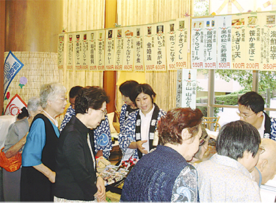 物産展では、日本酒や笹かま、菓子「萩の月」、福島県の桃など東北の名産品を中心に販売。入居者たちがそれらを買い求めて寄付に協力した。
