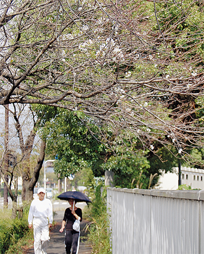 気温20度を上回るおだやかな陽気が続いた8日からの3連休に、数本の桜の枝から可憐な白い花が開花。2人連れで散歩していた人は「ほら見て、咲いている」と目を丸くしていた。