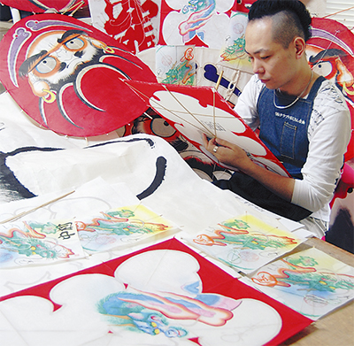 物心ついたときには、父親の見よう見まねで凧を作っていたという浅見さん。第一線を退いた父の後を継ぎ、今では絵柄の考案から色付け、組み立て、そして全国各地の百貨店等での実演販売までを担っている。