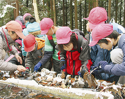 東小学校(高橋眞琴校長)4年生3クラス99人が、蓑毛自然観察の森ではだのエコスクール「虫たちの冬越しをみよう」に参加した。