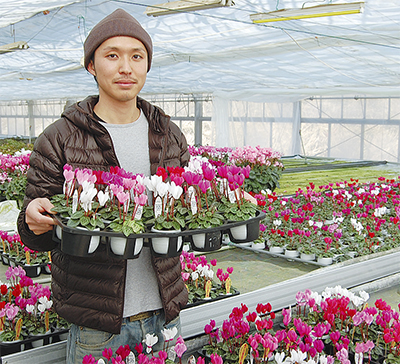 市内平沢在住の加藤毅雄さん(59)・光徳さん(29)が1月17日、経営する加藤花卉園芸の温室(名古木)から宮城県石巻市に向けてシクラメン150鉢を発送した。