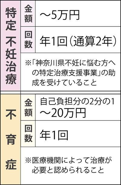 助成を受けるには「婚姻届をし、現在も婚姻関係にある」「治療・申請の時点で夫婦とも住民登録または外国人登録をして1年以上住んでいる」「『神奈川県不妊に悩む方への特定治療支援事業』の助成決定を受けている」「医療保険の被保険者または被扶養者」「夫婦の前年度所得合計が730万円未満」などの要件がある。