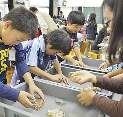 学校の環境学習支援を目的に市環境保全課が市内幼・小・中学校で行う出張理科講座。今回は小田原市の県立生命の星・地球博物館スタッフを講師に招き、戸川砥石の研究を行う地域団体も協力して実施された。