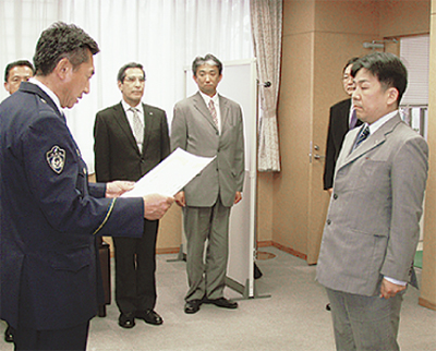 振り込め詐欺を未然に防いだとして3月25日、セコム株式会社秦野営業所の堤龍一郎さんが齋藤盛司秦野警察署長から感謝状を受け取った。