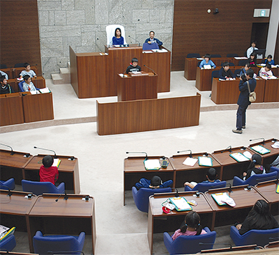 4組の体験では、初めて入る議場に興奮気味に周りを見回す子どもたちの姿も。議長の開会宣言のあと、議員役の児童が「はい、議長」と大きな声で手を上げて発言。「明かりを増やしてほしい」「歩道を作ってほしい」などの質問原稿を読み上げた。続いて、市長役の児童が答弁し、交代制で3回行われた。