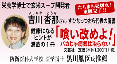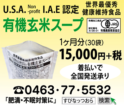 有機玄米スープ(1カ月分以上)を初めて注文の人に、「無添加和風だし」、本「喰い改めよ!」をもれなく進呈。(2013年12月末迄)