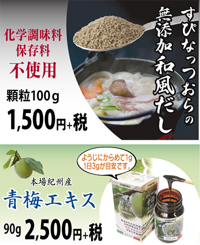 玄米スープの姉妹品として、この秋「無添加和風だし」を新発売。厳選した鰹節、あじ、煮干、昆布、椎茸、あさり、焼あごを原料に極上の旨味を顆粒状にした。紀州産青梅をじっくり煮詰め有効成分を濃縮した「青梅エキス」とあわせて、ぜひお試しを。