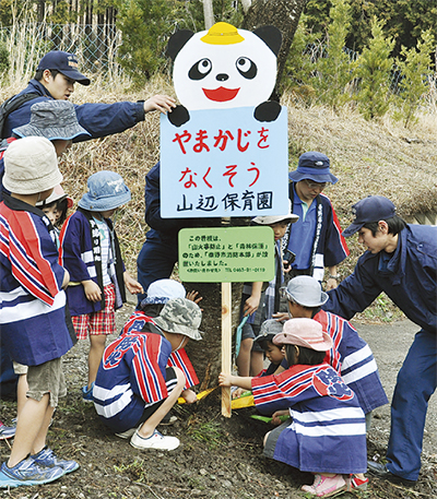 山辺保育園(秦野市横野57の1・金子歌子園長)の園児15人が2月28日、山火事防止を呼び掛ける手作りの看板を市消防本部の署員と協力して、羽根林道入口付近に設置した。