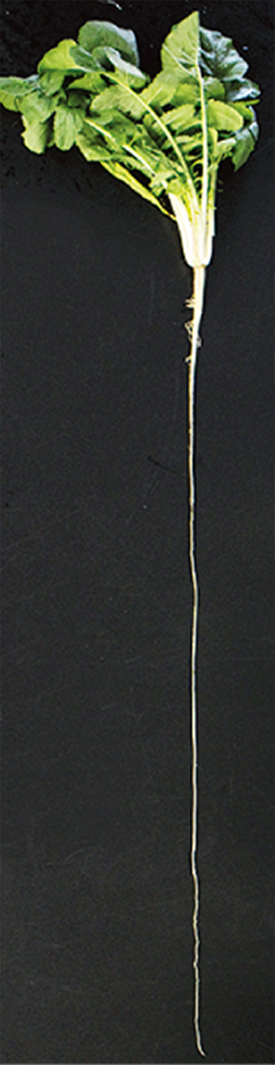 礒野さんと鈴木さんは、消滅した波多野ダイコンを復元し、いずれは秦野の特産品として地域振興につなげようと研究をスタート。園芸学の専門家に助言をもらい、かつての種子が川を流れてきた可能性があることから、金目川中流から花水川河口までを調査。ダイコン様植物体110個体から波多野ダイコンに形態が近い個体の種子を採取、栽培した。昨年12月、胴回り約7センチ、根が140cm近い長さの個体を収穫。形態調査ならびにDNA解析の結果、波多野ダイコンに近い性質のものであることが示唆された。