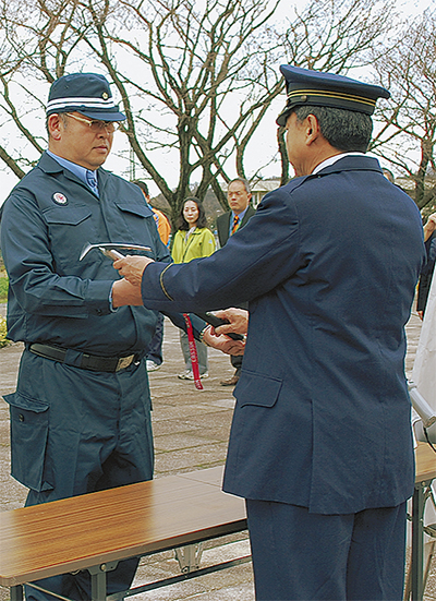 本格的な登山シーズンを前に神奈川県立秦野戸川公園で4月4日、秦野警察署(齋藤盛司署長)の「丹沢臨時警備派出所」(戸川・戸沢の出合い)の開所式が行われ、齋藤署長から同隊の高楯俊一隊長に装備品のピッケルが預けられ、活動開始が告げられた。