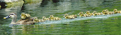 今泉名水桜公園(秦野市今泉426の1)の湧水池で、連なって泳ぐカルガモの親子の姿が来園者の目を楽しませている。