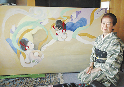 鶴巻北で「アトリエ山桃」を主宰する紫藤邦子さん(74)が善昌寺(鶴巻南3の6の18)へ寄付するために描いていた7枚の壁画が完成した。この作品は8月2日(土)・3日(日)に宮永岳彦記念美術館市民ギャラリー(鶴巻北3の1の2)で展示された後、同寺に常設される。
