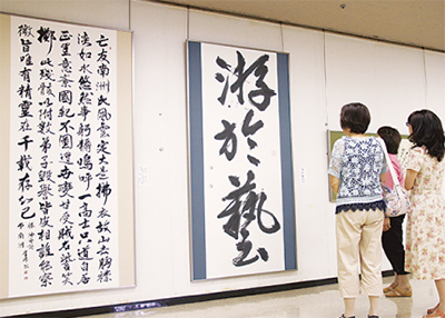 会場では硯城書道会主宰を務める書道家・栗原雀邨氏による作品や同書道会会員による力作も展示。栗原氏による今回のテーマ「游於藝(芸に遊ぶ)」にはその大きさから伝わる迫力があり、来場者も足を止めていた。他にも会員らによる繊細な作品なども展示され、来場者は墨と紙が織りなす世界に見入っていた。