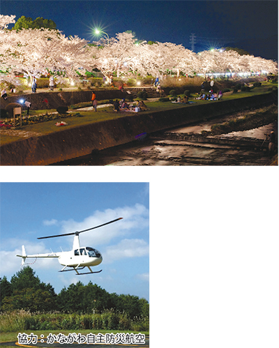 かながわ自主防災航空の協力を受け、約1000本のソメイヨシノが咲く弘法山公園やこのほど公募で名称が決まった県内最長の桜並木「はだの桜みち」(西大竹〜堀山下、約6・2Km)などを上空から観覧してもらおうという企画。費用は小学生以上4000円、未就学児3000円(保険料込み)。実施は5日のみで当日先着60組。上智大学短期大学部グラウンド発着で約5分間の空中散歩を楽しむ。