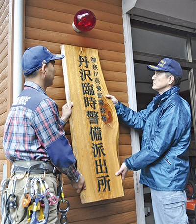 本格的な登山シーズンを前に神奈川県立秦野戸川公園で4月3日、秦野警察署(村松康夫署長)の「丹沢臨時警備派出所」(戸川・戸沢の出合い)の開所式が行われた。