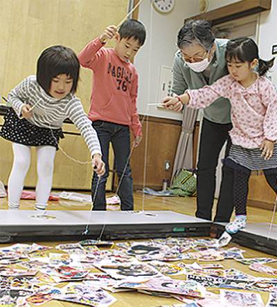 渋沢公民館で3月26日、「秦野の民話の紙芝居と遊び会」が開催され、約70人の子どもたちが参加。老人会のメンバーが遊び方を教え、異世代交流を行った。