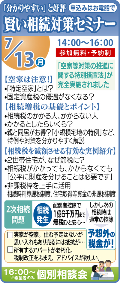 セミナーでは同法や相続増税のポイントなどをやさしく解説するほか「子どもが独立し夫婦2人には広すぎる自宅」など身近な実例を取り上げ、対策方法を多数紹介。ぜひ参加を。