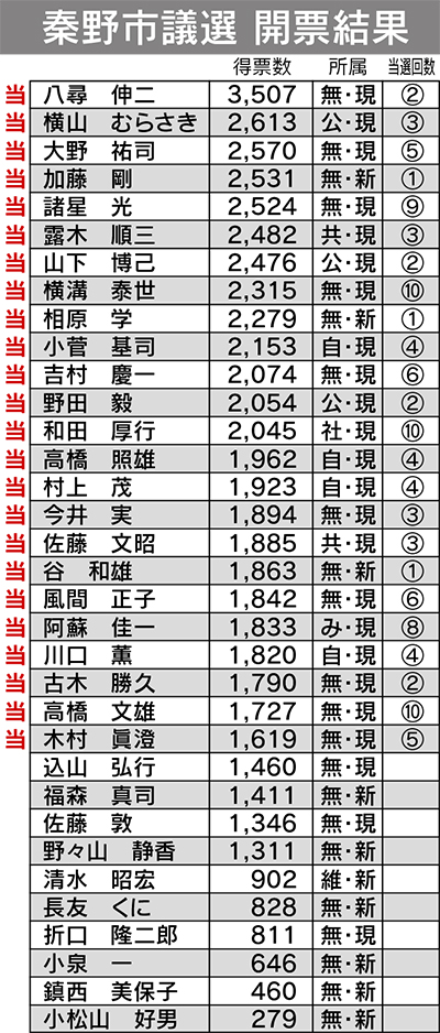 今回の選挙には、現職24人全員と新人10人が立候補。それぞれが地域経済の活性化や人口減少、高齢化社会対策、秦野赤十字病院の産科再開などを訴えた。