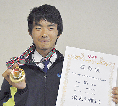 小学生の時は野球少年だった石井君。肩を痛め、野球から一時離れていたところ、小学校6年生の時に走幅跳で記録を出し、それから陸上を続けてきた。今回、目標としていた記録を達成した石井君は「嬉しかった」と優勝の喜びを語る。