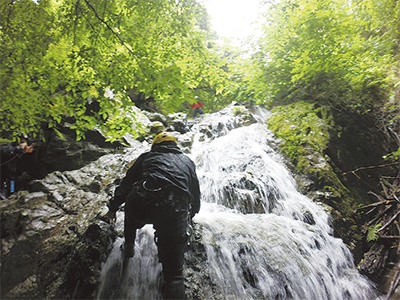 シャワークライミングとは、清流の流れる渓谷を源流に向かって進み、滝を登ったり、滝壺に飛び込んだり、積極的に沢の水を浴びながら沢を登っていく遊び。現在、丹沢には多数のツアーが存在しているという。今回は、KinTouN(きんとうん)の峯岸健一さんにお世話になった。