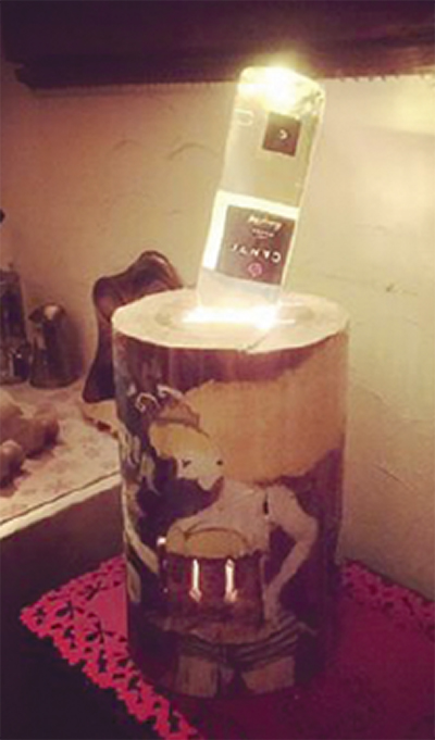 8月、中村さんは友人である宅見さんの店にデザイン画を施したロケットストーブを持参。そこには店名の「フーコ」(イタリア語でオスのミツバチ)にちなんだ絵が描かれていた。宅見シェフは話に感心し、同店を訪れた人たちに喜んで貰えればと、ワインボトルと電球を取り付けてインテリアにした。完成した姿を見て、下田さんと中村さんも喜んでいたという。宅見さんは「二人と一緒に間伐材に命を吹き込めた気がします」と話した。