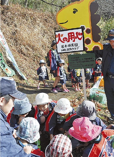 天候に恵まれ、穏やかな陽気となった当日は、子どもたちが「火の用心」と書かれた揃いのはっぴを着て参加。土を掘る際の注意事項や、山火事防止看板を設置する理由が説明されたあと、スコップを手に取り、土を掘る作業に取りかかった。その後、職員らによって看板が設置されると、子どもたちからは歓声が上がった。