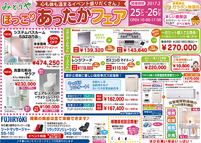 住まいの頼れるパートナー(株)みどりや(露木徳英社長)では2月25日(土)・26日(日)に、お得いっぱいのイベント「ほっこりあったかフェア」を開催。午前10時〜午後5時。入場無料。