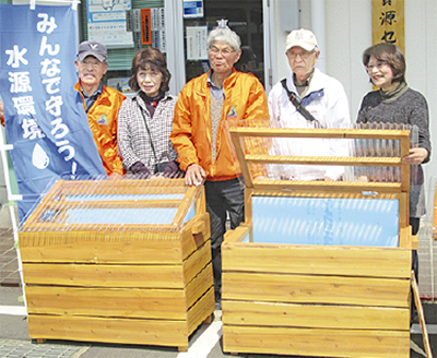 秦野市で環境保全活動を行っているNPO法人四十八瀬川自然村(小野均代表)が3月30日、市環境資源センターを訪れ木製コンポスト20基を寄贈した。