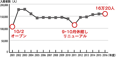 ところが2011年、9月〜10月に2カ月間休館してリニューアルすると、翌年度から徐々に客足が回復。2014年度は15万6806人、2015年度は15万9566人まで増加し、2016年度の入場者数は16万20人だった。