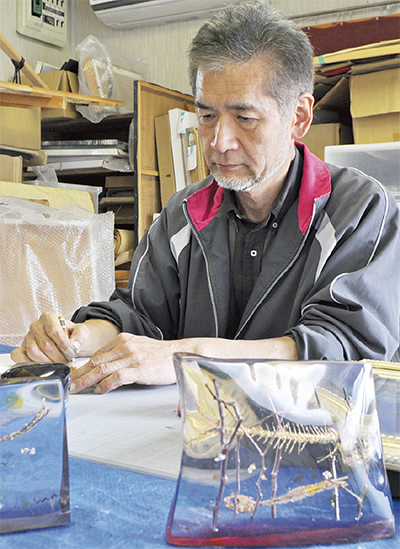 三嶋さんの代表作品といえば、樹脂の中に植物や魚の骨などを閉じ込めた立体オブジェ。樹脂を流し固め、素材を入れ、また樹脂を流し入れるという作業を繰り返し、最後に表面を研ぎ、艶を出していく。どんなに小さくても制作期間は1カ月以上になるというが、「儚いものが永遠化することが面白い」のだという。この技法は「FRP(強化プラスチック)研ぎ出し技法」といい、1978年に三嶋さんが特許を取得している。